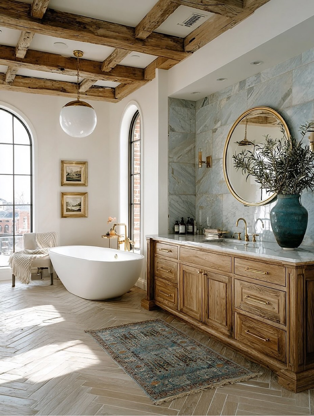 Use neutral towels and layered rugs for comfort.