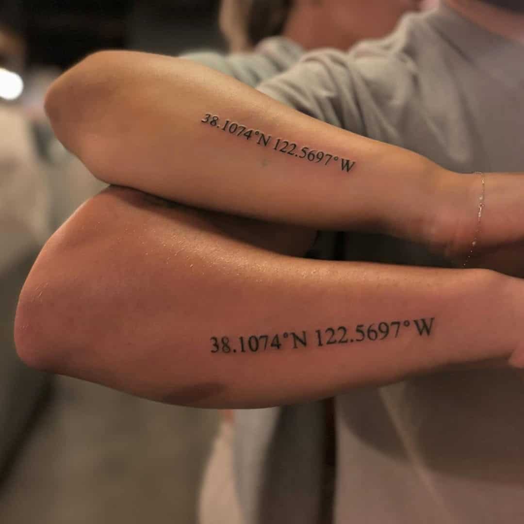 Matching coordinate tattoos mark a meaningful location shared by both people—such as the place they met, a hometown, a first date spot, or a life-changing event location. These tattoos are subtle, personal, and meaningful without revealing too much. Coordinates can be styled as clean numerical lines, decorative compass-inspired designs, or accompanied by small icons such as hearts, waves, or mountains. Ideal for wrists, collarbones, or behind the arm, these tattoos serve as a permanent reminder of a place that shaped the bond. They symbolize shared history, memories, and the journey that brought two people together.