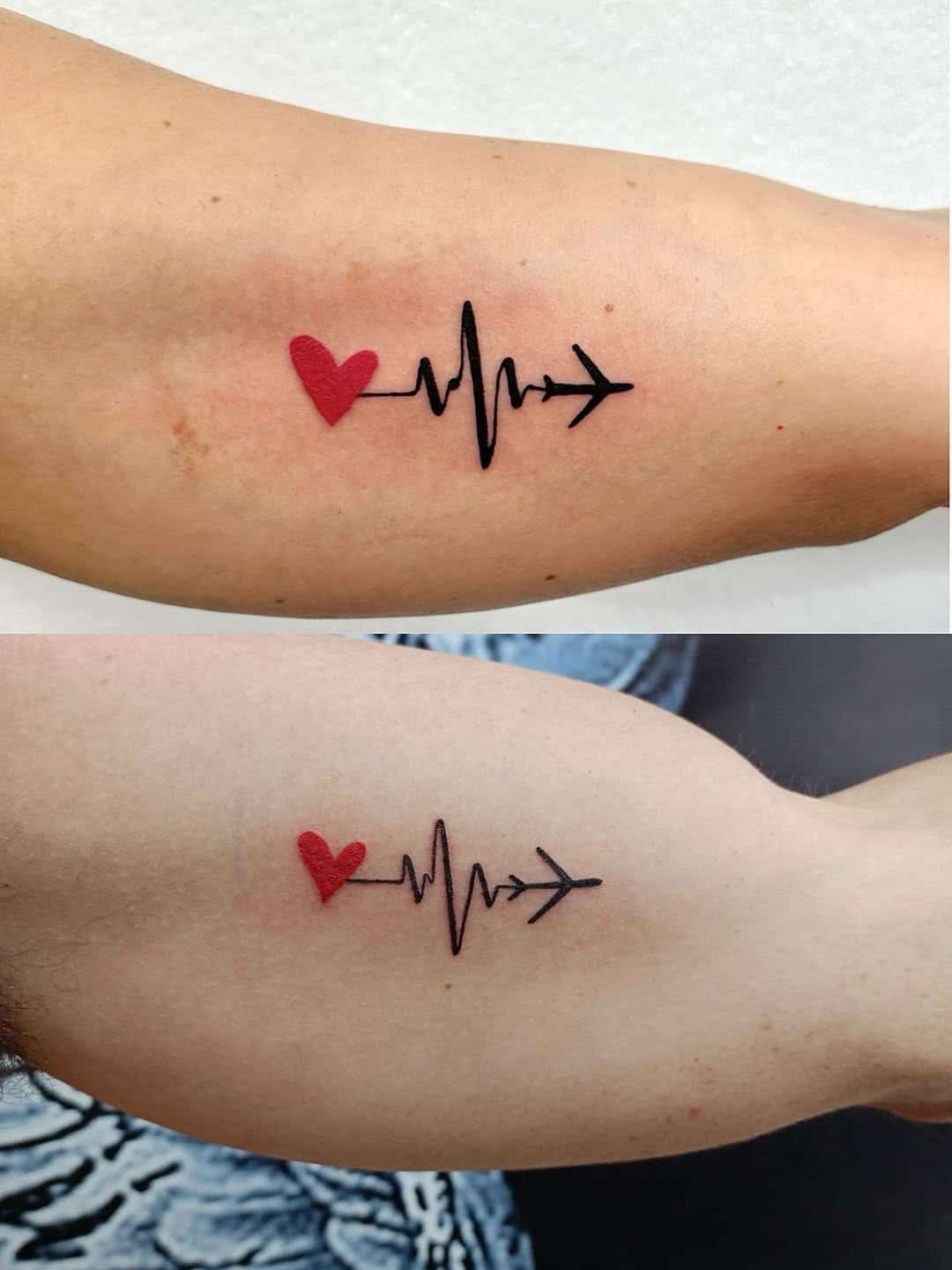 Heartbeat tattoos mimic the wave-like pattern seen on EKG monitors, symbolizing life, emotion, and shared existence. Matching heartbeat tattoos often include a heart, a date, or a small symbol that ties them together—such as initials or coordinates. They look especially clean and elegant as thin line designs on the wrist, ribs, or forearm. For couples, this expresses love and emotional connection; for friends or family, it represents unwavering support and shared life experiences. When placed side-by-side, the heartbeats flow into one another, creating a united rhythm that symbolizes two hearts beating in harmony despite life’s changes.