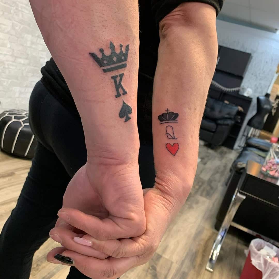 Inspired by playing card symbols or royal crowns, King and Queen tattoos represent mutual loyalty, respect, and partnership. Designs may include the initials K and Q with small crowns, full card-style illustrations, or minimal line art. When placed on hands, wrists, or necks, they create a bold statement about unity and commitment. These tattoos signify that each person views the other as their equal partner—someone worthy of admiration and devotion. Whether designed in black ink or enhanced with subtle shading and tiny details, King & Queen tattoos express strength, teamwork, and the idea of building an empire together.