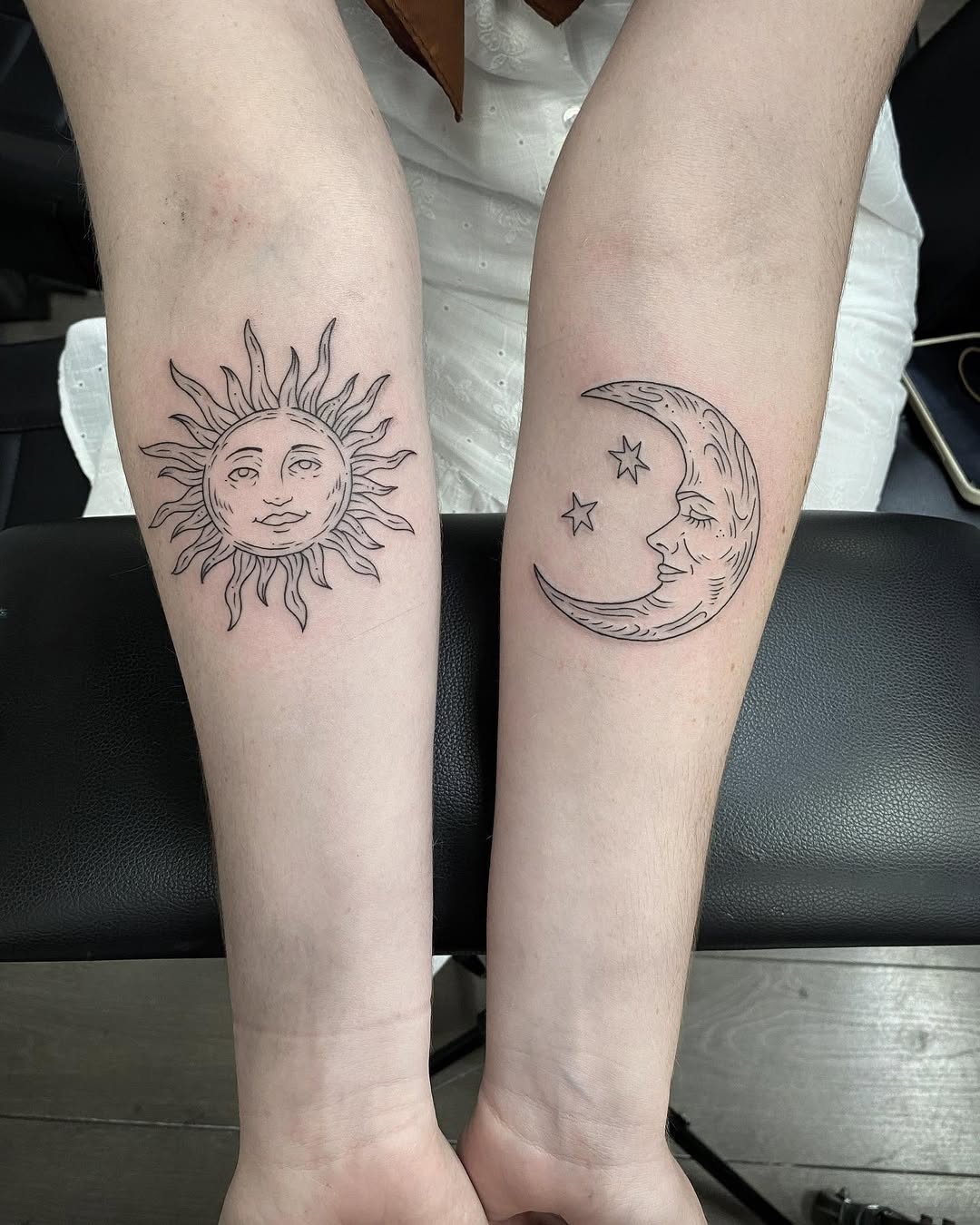 A timeless symbol of balance, sun and moon tattoos represent harmony between opposites—light and dark, masculine and feminine, energy and calm. One partner wears the radiant sun, symbolizing warmth, optimism, and life force, while the other wears the serene moon, representing intuition, peace, and emotional depth. When placed on wrists, forearms, or ankles, they create a visually stunning pairing that feels connected even when apart. These tattoos work beautifully in minimal line art or detailed celestial designs featuring rays, stars, and subtle shading. Together, they express unity, complementing personalities, and the idea that two different souls complete each other.