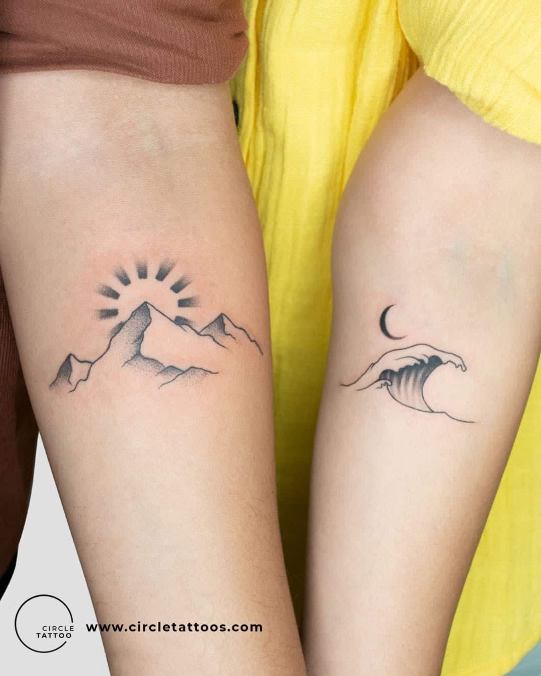 Wave and mountain tattoos represent two contrasting but harmonizing elements—adventure and stability, spontaneity and grounding. One person gets a simple mountain outline, symbolizing strength and endurance, while the other gets a delicate wave design representing flow, freedom, and emotional depth. Together, they illustrate how two different energies unite to balance each other. These tattoos are fantastic for outdoor lovers or partners who see their relationship as both a grounding force and an exciting journey. Minimalist line styles or detailed nature-inspired designs work beautifully, especially on the wrist, ankle, or forearm.