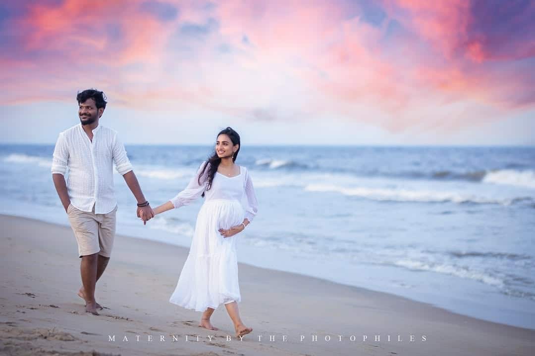 A beach maternity session captures the vastness of the ocean, symbolizing the journey of motherhood. Soft waves, shimmering sands, and pastel skies create a tranquil environment. Flowing chiffon dresses or bare-foot poses enhance the natural, serene vibe. Capture walking shots, silhouette images, and hands-on-belly poses against the glowing horizon. The water adds gentle movement and reflective beauty. This idea is ideal for mothers who want an airy, peaceful aesthetic. The calming sound of the waves often helps the mother relax, resulting in beautifully natural expressions and dreamy photos.