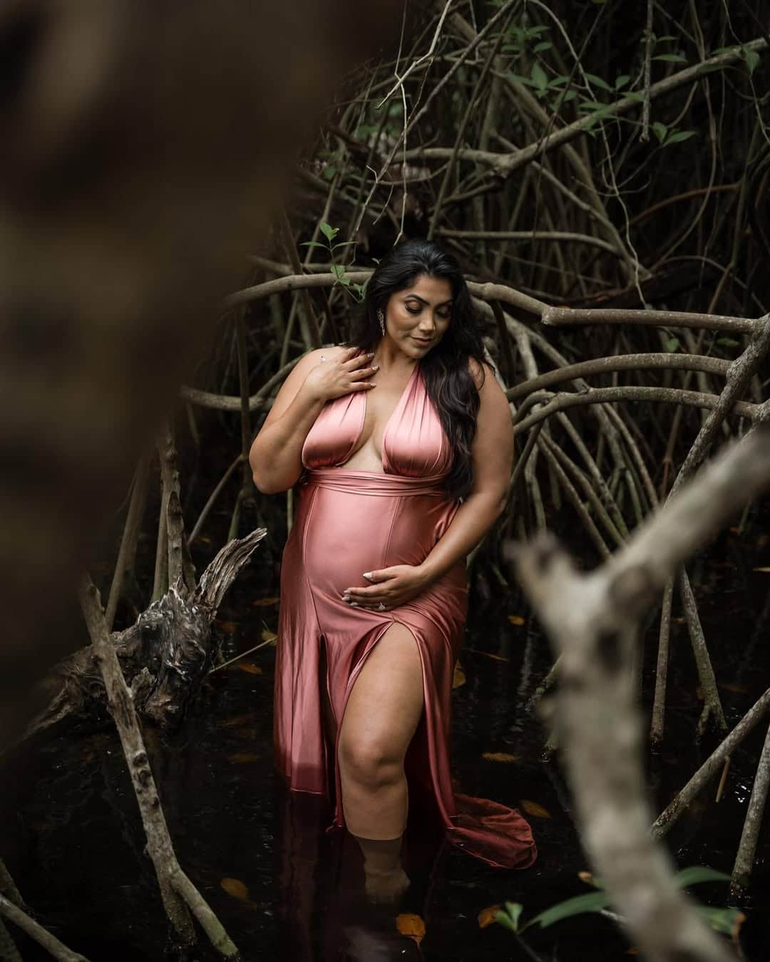 For a magical, whimsical vibe, a forest setting offers enchanting backdrops with tall trees, dappled sunlight, and mossy paths. Style the expecting mother in an earthy gown—greens, browns, or jewel tones work wonderfully. Add fairy lights, lanterns, or a flower crown for extra charm. Capture shots among tree trunks, sitting on logs, or walking through misty trails. This theme emphasizes mystery, wonder, and the magic of new beginnings. It’s especially ideal for those who love nature or want a unique storytelling concept for their maternity album.