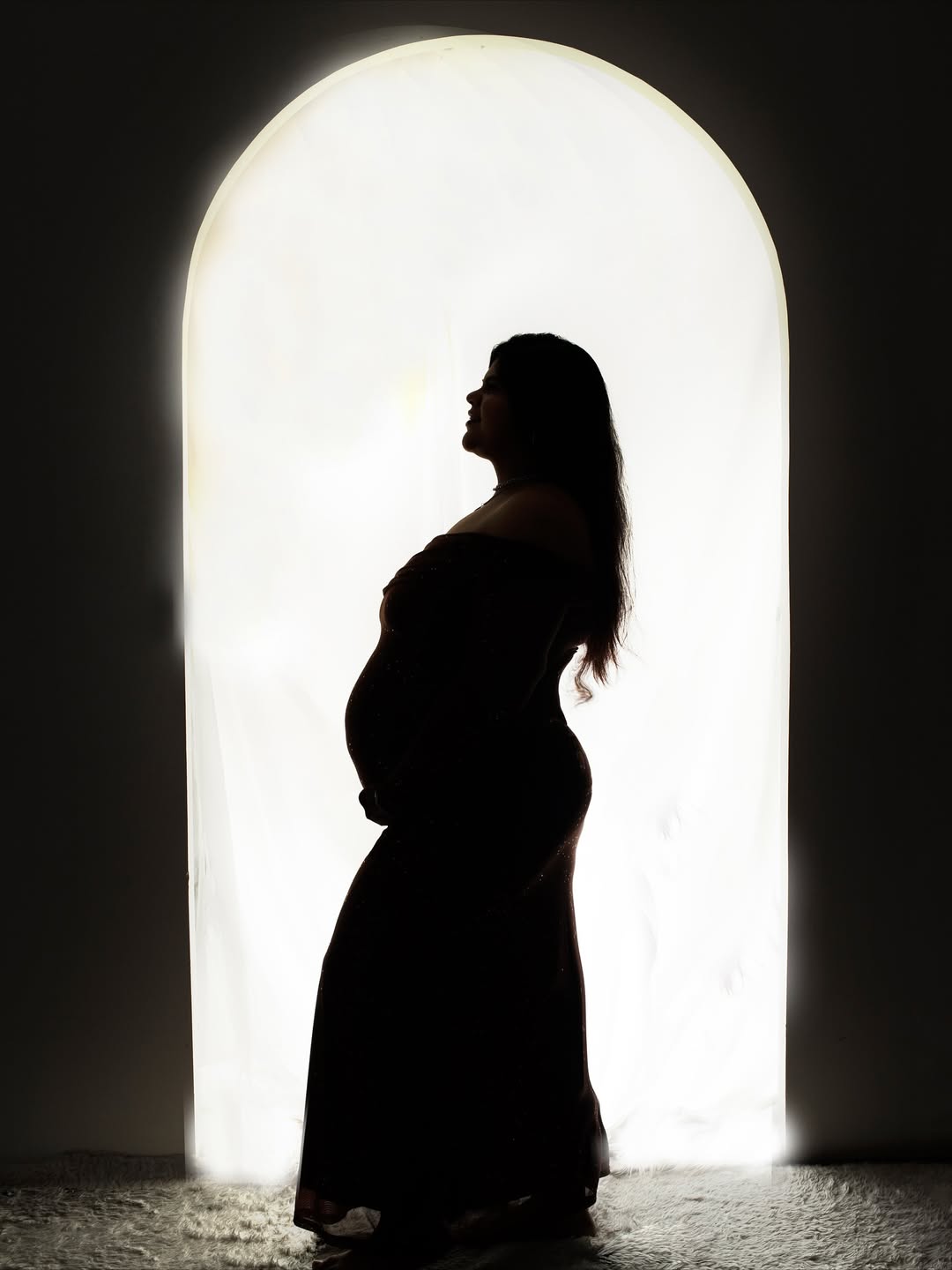 A beautifully backlit photoshoot using a large window creates soft, natural outlines of the expecting mother’s shape. This style focuses on the curve of the belly and elegant poses. Light curtains, sheer fabrics, or a simple fitted dress enhance the effect. Capture side profiles, seated poses, or gently touching the bump. This concept feels artistic, intimate, and timeless. Black-and-white editing works especially well to emphasize shape and emotion. This idea is ideal for mothers who want subtle, elegant, emotional imagery with minimal distractions and pure storytelling.