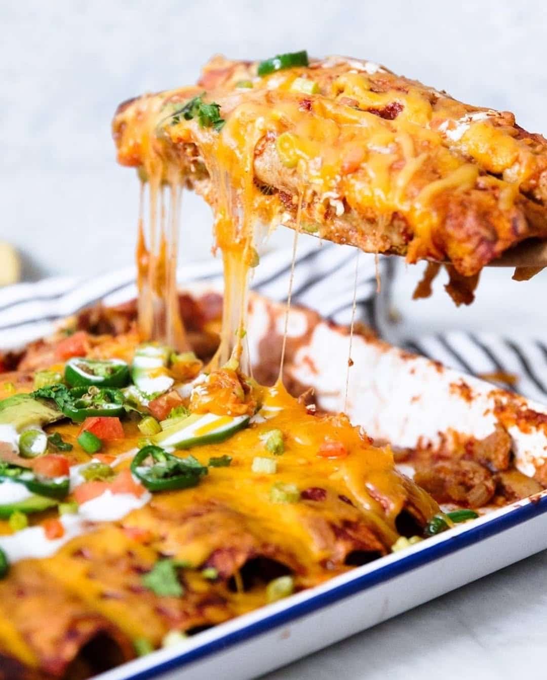 Fill tortillas with the mixture, roll tightly, and place seam-side down in a baking dish.