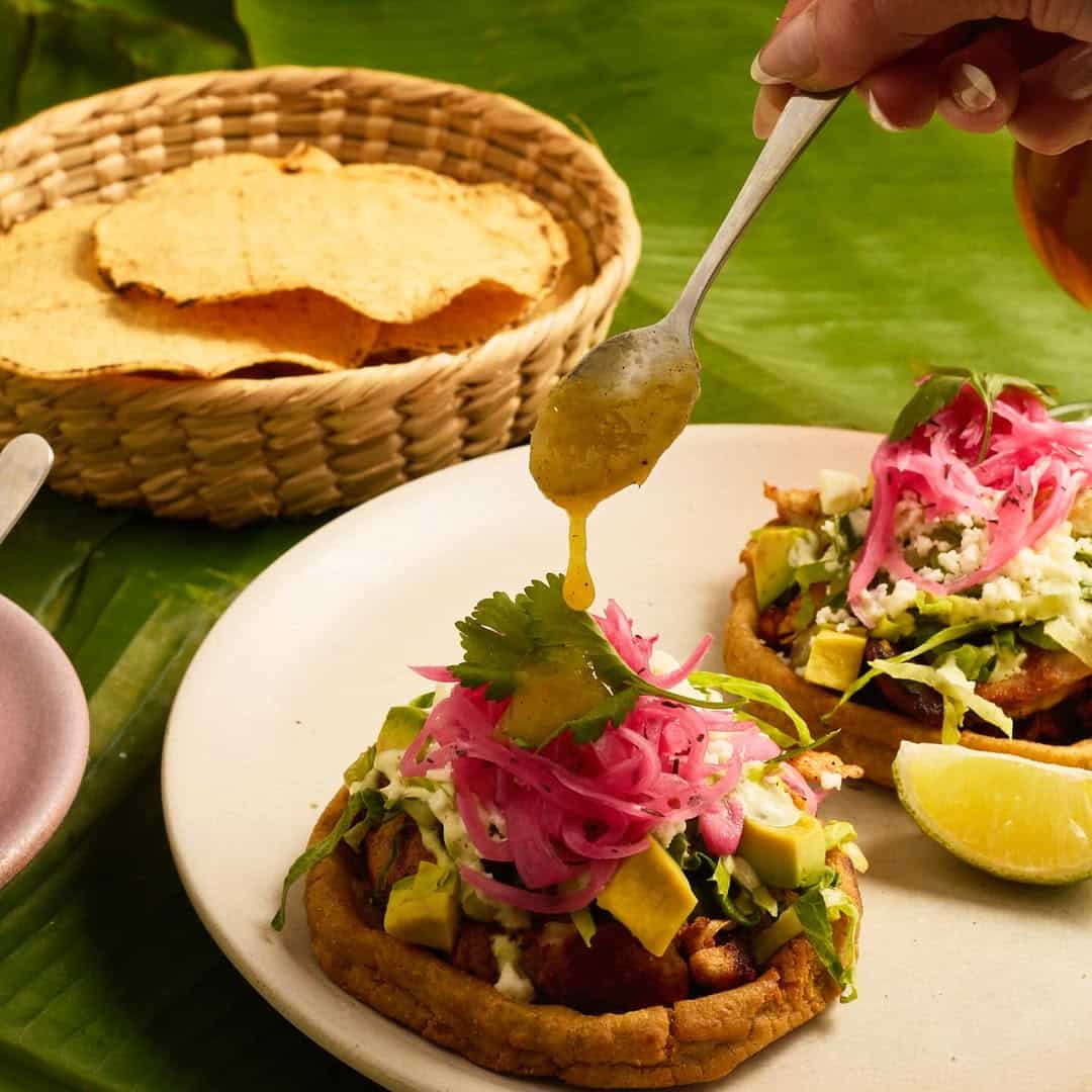 Toppings: refried beans, shredded meat, lettuce, cheese, salsa