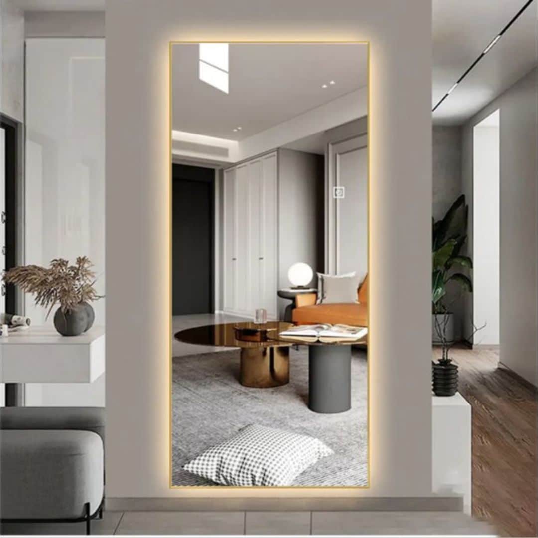 A backlit mirror adds a subtle, sophisticated glow to your living room. LED strips installed behind the mirror create a floating effect, giving the wall a soft halo of light. This works particularly well for evening ambience, making the space cozy and inviting. Use it as a centerpiece above a console or sofa. Pair it with modern furniture and clean lines for a futuristic feel. The light also enhances the mirror’s reflective quality, making your living room appear brighter without using harsh overhead lighting.