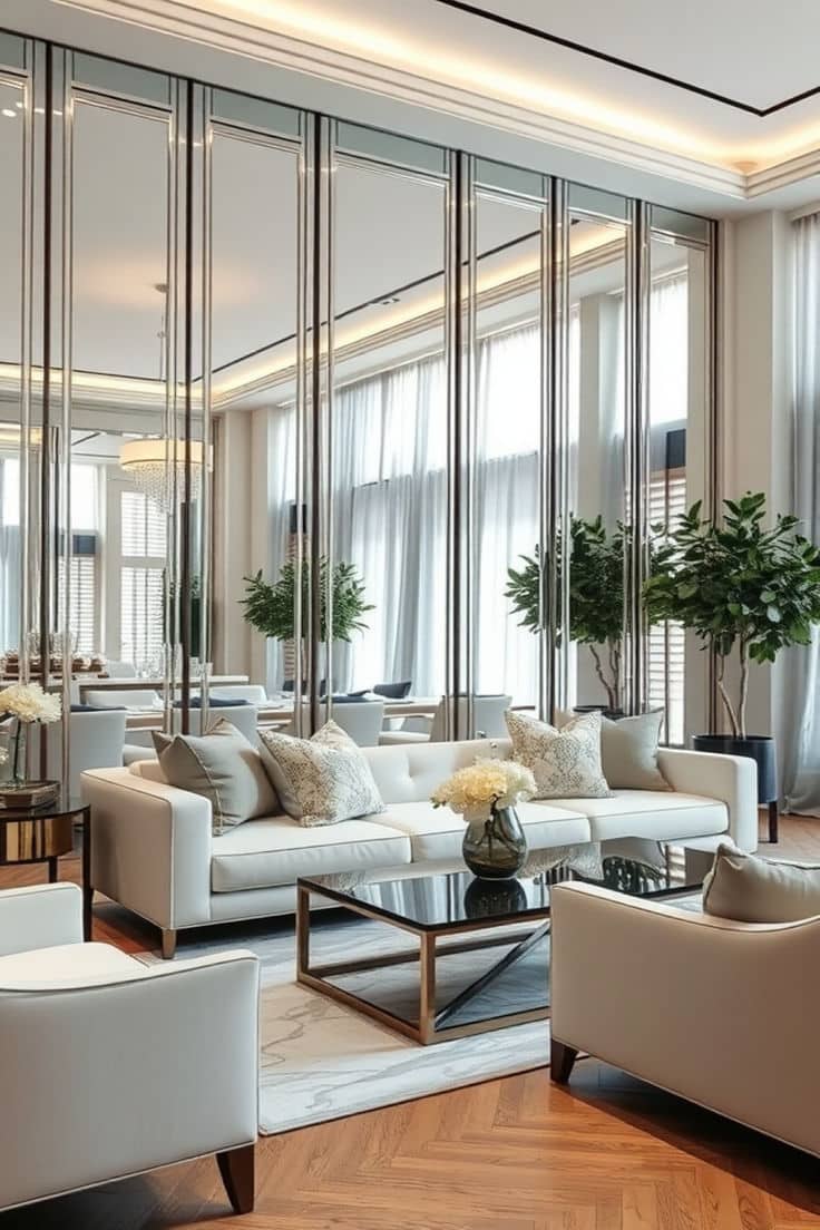 Installing a floor-to-ceiling mirror panel creates a luxurious, contemporary effect in your living room. These mirrors can be installed as a single sheet or in segmented tiles for added texture. They instantly enlarge the room and create a sleek, hotel-like ambiance. Place them behind a seating area or along a long wall to maximize the illusion of spaciousness. Combine the panels with soft lighting, minimalist furniture, or neutral tones to keep the look balanced and elegant. This idea is perfect for modern or compact living rooms seeking visual expansion.