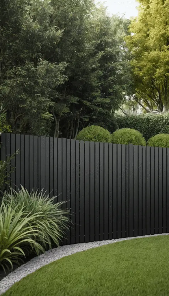 Modern fence ideas emphasize clean lines, unique materials, and privacy with style. Horizontal slat fences in wood, metal, or composite materials are popular for their sleek, low-maintenance appeal. Black powder-coated steel or aluminum panels give a contemporary industrial look, while frosted glass or vertical gardens provide elegance and functionality. Combining wood with concrete bases adds contrast and durability.