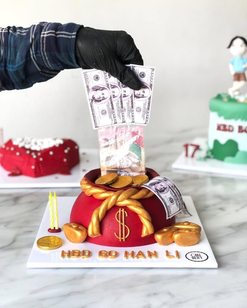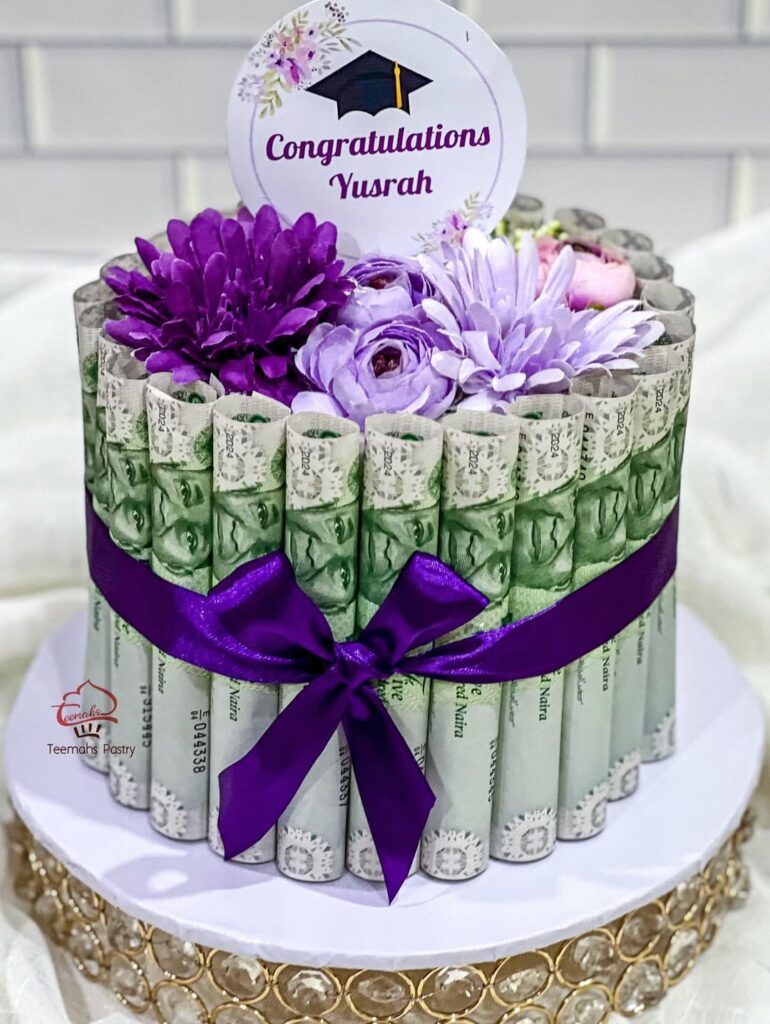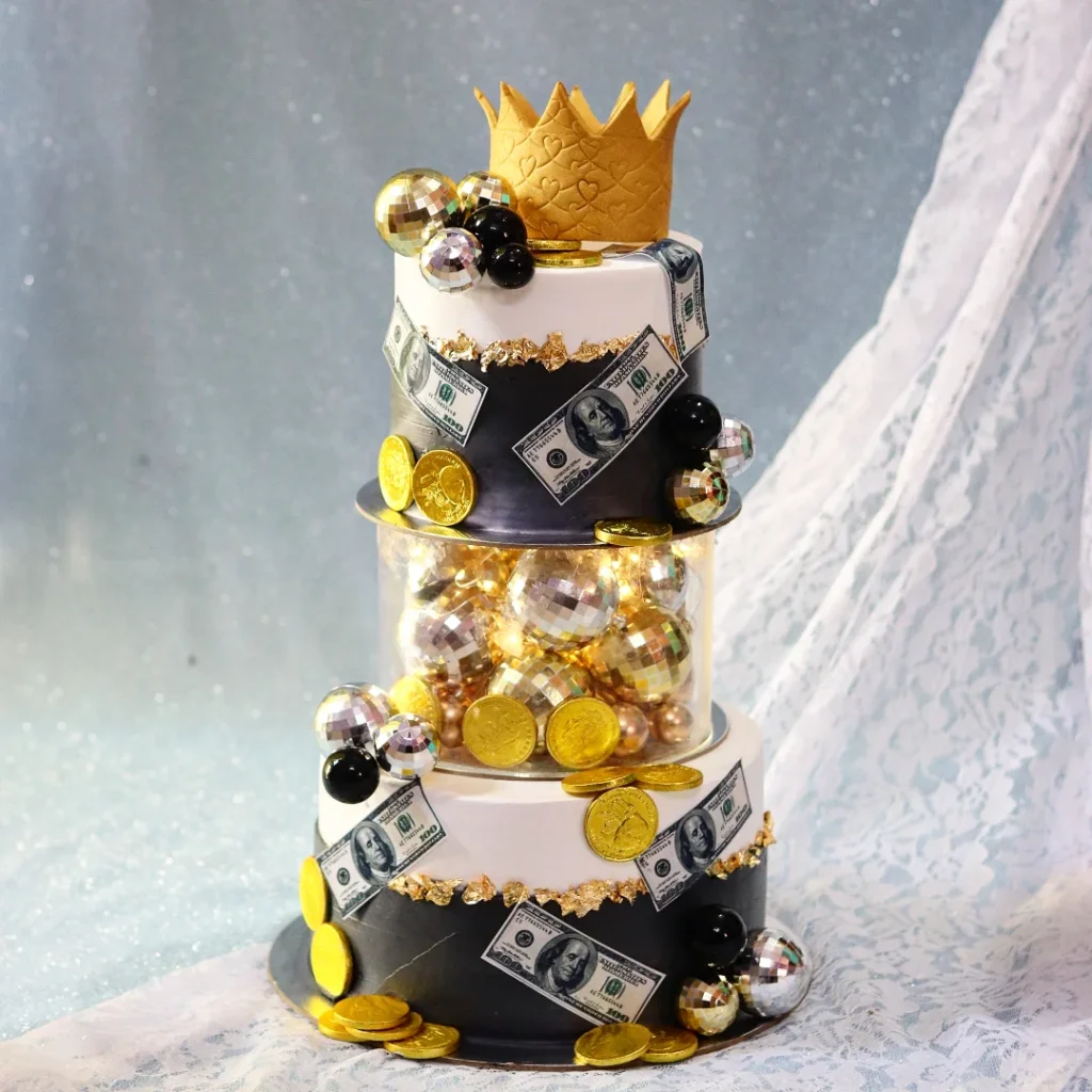 Some designs place money in a clear box on top of the cake, surrounded by buttercream flowers or chocolate decorations. Colors like gold, black, white, and emerald green are often used to give a luxurious feel. Money cakes can be customized to match hobbies or dreams, such as travel-themed cakes with money folded like airplanes. Overall, money cakes turn a simple cash gift into a memorable, interactive, and visually stunning centerpiece that adds excitement and personal meaning to any celebration.