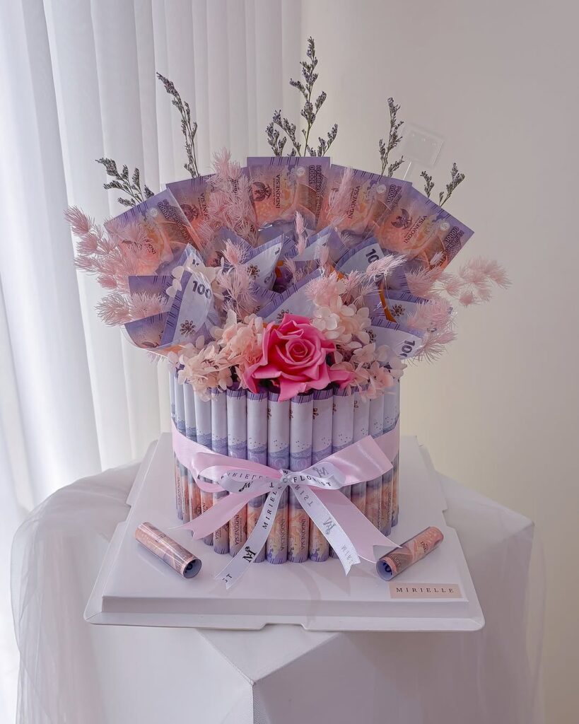 Money Flower Cake is a beautiful celebration cake designed to look like a blooming flower while hiding rolled currency notes or paper “money” decorations inside for a surprise effect. It’s popular for birthdays and special occasions where gifting money in a creative way is fun and memorable. The cake itself is soft, fluffy, and lightly sweet, paired with creamy frosting that holds the flower design perfectly.