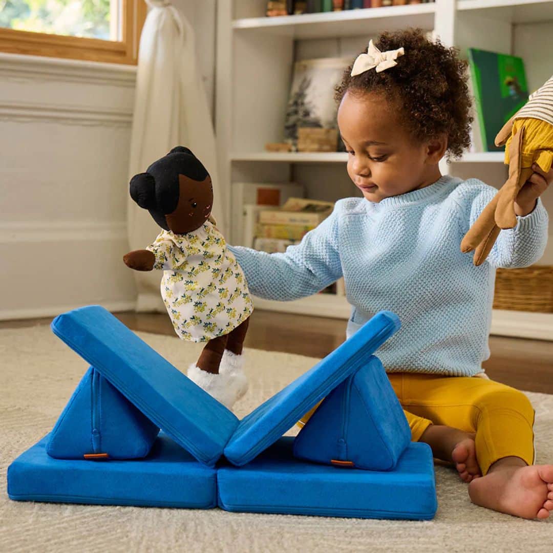 Form a backdrop using the base cushions vertically. Use the triangle pillows as side walls and drape a cloth in front to create a puppet theater. Children can perform puppet shows or plays using dolls or plushies. It’s a great way to boost confidence, creativity, and communication skills.