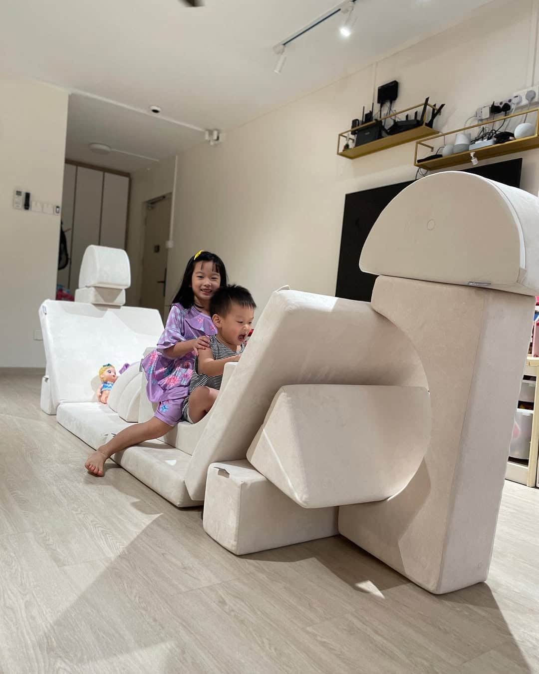 Create a slope using a folded base cushion as a ramp and stack another base for height. Kids can climb up one side and slide down the other, developing coordination and strength. This setup is ideal for toddlers and preschoolers and can be rearranged safely for indoor physical activity.