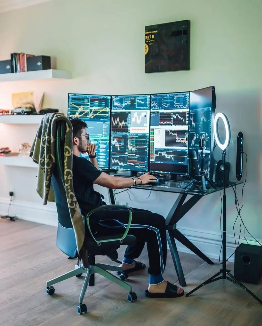 Keep the trading desk clean and clutter-free using a minimalist design approach. Use hidden storage compartments, cable trays, and wireless accessories to maintain an open visual field. Neutral tones—white, grey, or matte black—calm the mind and reduce overstimulation during heavy market swings. A single plant or sculptural object adds softness without visual noise. The goal is to create a space where every item has a purpose, encouraging mental clarity, discipline, and efficient workflow. This minimalist environment supports traders in staying focused and emotionally balanced throughout the trading day.