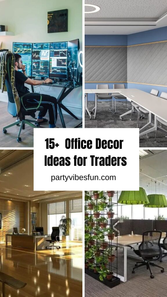 Office Decor Ideas for Traders – Office décor for traders centers around creating a high-performance environment optimized for focus, real-time decision-making, and stress management. A trader’s workspace often features multiple monitor setups mounted on adjustable arms to track charts, news feeds, and trading platforms simultaneously. The room should prioritize ergonomic design, including a supportive chair, sit-stand desk, and proper monitor height to reduce fatigue during long trading sessions. The décor style is typically modern and minimal, using clean lines and muted tones—think charcoal, navy, or metallic accents—to help maintain a sharp mental state. LED strip lighting or bias lighting behind monitors can reduce eye strain while enhancing the overall ambiance.