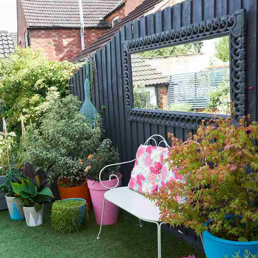 Install outdoor-safe mirrors on your fence to add visual interest and create the illusion of more space. Mirrors reflect light, making smaller yards feel brighter and more open. Choose rustic, vintage-style frames for a charming cottage feel or modern, frameless mirrors for a sleek design. Position them strategically to capture sunlight or reflect garden highlights like flower beds or sculptures. Use secure mounting hardware to withstand outdoor conditions and ensure safety. This décor idea adds depth and intrigue, especially in shaded or enclosed garden areas.