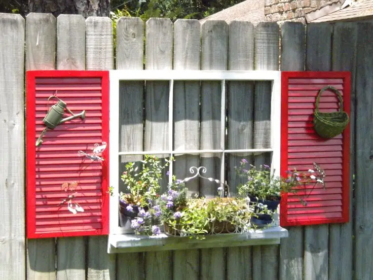 Attach old window frames or colorful shutters to your fence for a shabby chic or rustic look. These elements can be painted to match your garden’s color scheme or left with their weathered patina for character. Window frames can be backed with mirrors, planters, or art to give depth. This DIY project is budget-friendly and perfect for upcycling materials. It adds a charming, unexpected touch and works well in cottage gardens, farmhouse-style yards, or eclectic outdoor spaces.