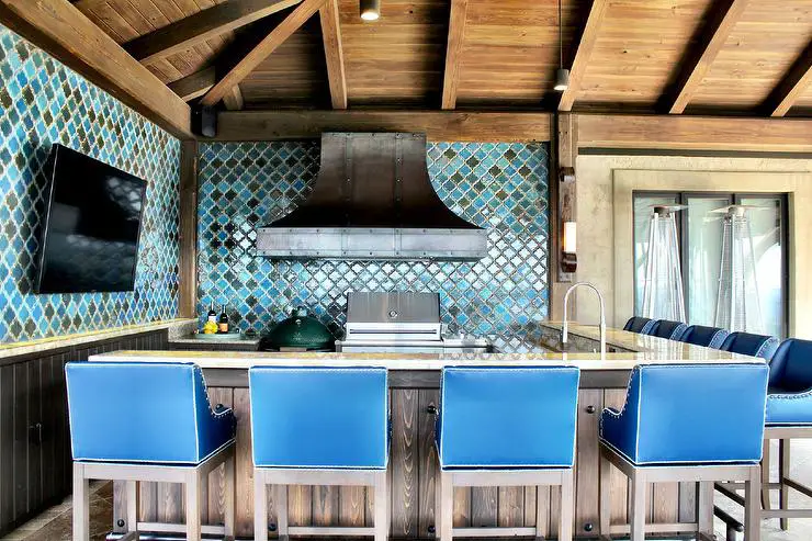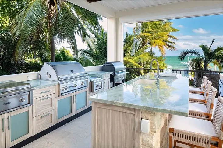 Bring seaside serenity to your backyard with a coastal-style patio kitchen. Use light blue and white tones, natural teak wood, and rope accents. A whitewashed pergola provides shade while open shelving displays glassware and decorative seashells. Install a seafood-friendly grill station and a cooler drawer for drinks. Coastal textures like rattan stools and linen cushions create breezy comfort. Add nautical lanterns for evening ambiance. This setup evokes the charm of a beachside café, perfect for grilling fresh seafood and sipping cocktails while listening to the sound of the wind through palm leaves.