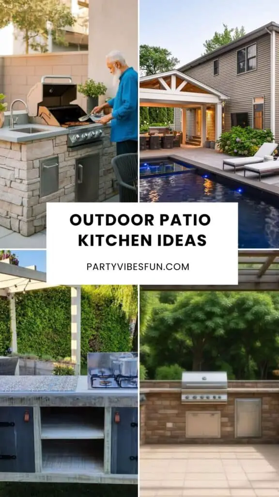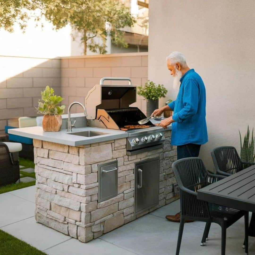 For small patios, efficiency is key. This design maximizes every inch with a built-in grill, slim stone countertop, and vertical storage racks for tools. A fold-down prep surface provides extra workspace when needed. Use durable materials like concrete and stainless steel to withstand city weather. Add a narrow herb garden or wall planter for freshness and greenery. Integrated lighting and compact seating make the area cozy yet functional. The result is a stylish, space-saving outdoor kitchen perfect for city dwellers who love to entertain without sacrificing comfort or style.