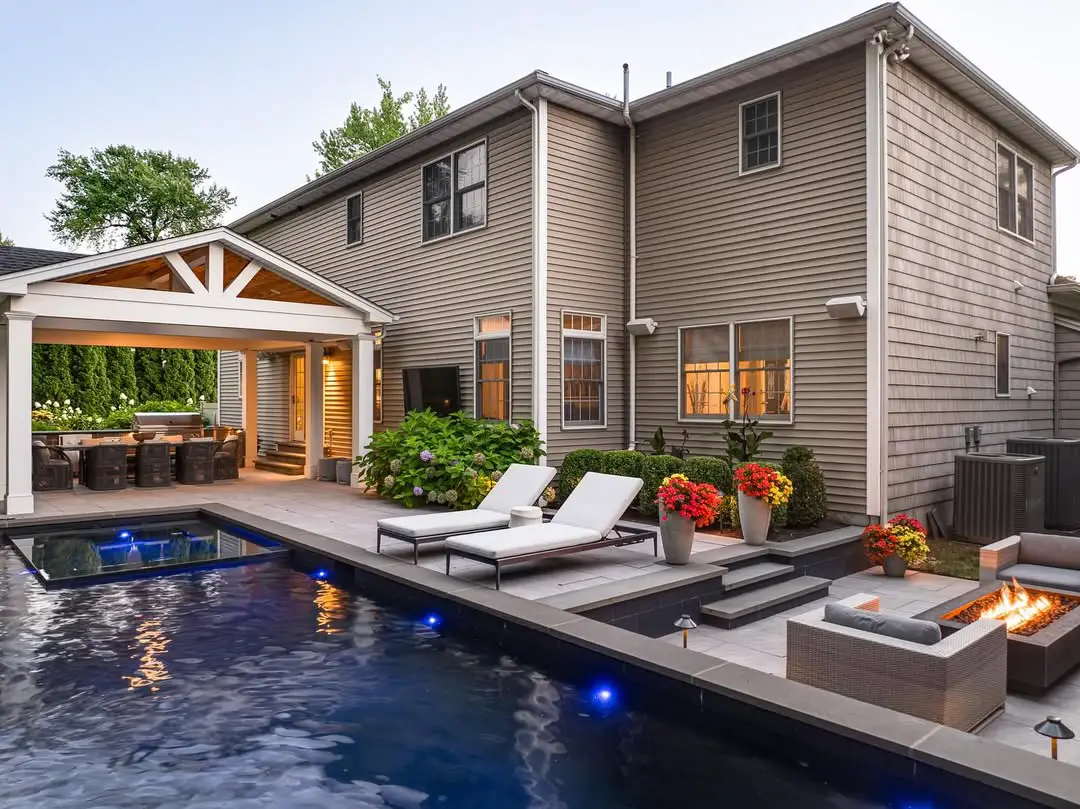 Create a high-end resort vibe with a poolside outdoor kitchen complete with marble countertops, a wine cooler, and a built-in barbecue. Add plush lounge seating under a pergola for relaxation after meals. A wet bar with LED backlighting enhances the ambiance for evening parties. Neutral tones, elegant finishes, and a water feature nearby complete the serene atmosphere. This luxurious setup encourages long afternoons of sun, swimming, and gourmet grilling—bringing the sophistication of a private resort right into your backyard.