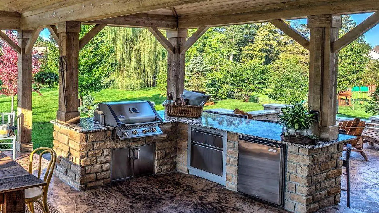 Timeless and durable, a brick patio kitchen offers warmth and character. A red brick island with a granite top pairs beautifully with wrought iron fixtures. Add a built-in grill, smoker, and wood-fired oven for versatility. Surround the area with lush landscaping and soft lighting to highlight the texture of the brick. A matching brick fireplace or fire pit nearby enhances the cozy feel. This design delivers a nostalgic yet enduring aesthetic—perfect for family cookouts and evening gatherings all year round.
