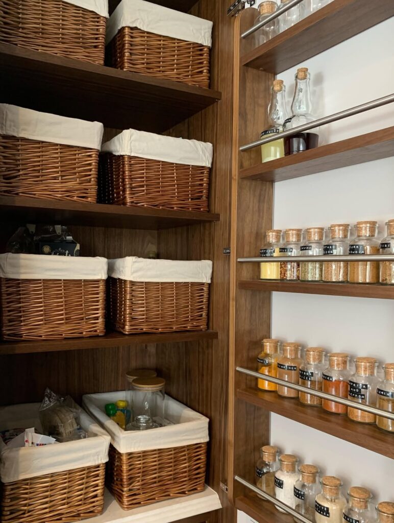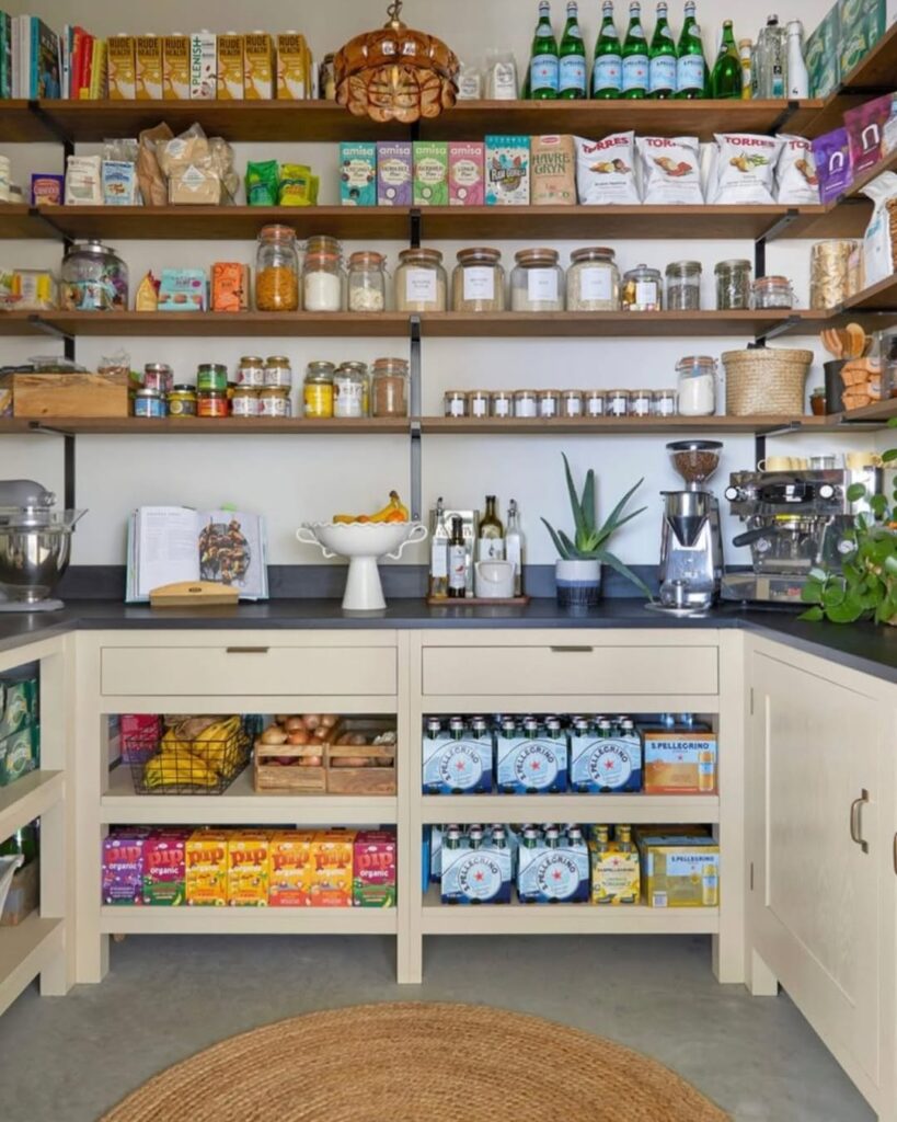 Corner wrap-around shelves turn awkward pantry corners into highly functional storage areas. Instead of losing space in hard-to-reach corners, these shelves extend along both walls, creating continuous storage. They are great for storing bulk goods, baskets, or appliances. Rounded or angled designs improve accessibility. Using consistent containers makes the space look cohesive. Good lighting enhances visibility in corners. This design maximizes space efficiency and gives your pantry a custom-built appearance. It works well in walk-in pantries and helps maintain a balanced, organized layout.