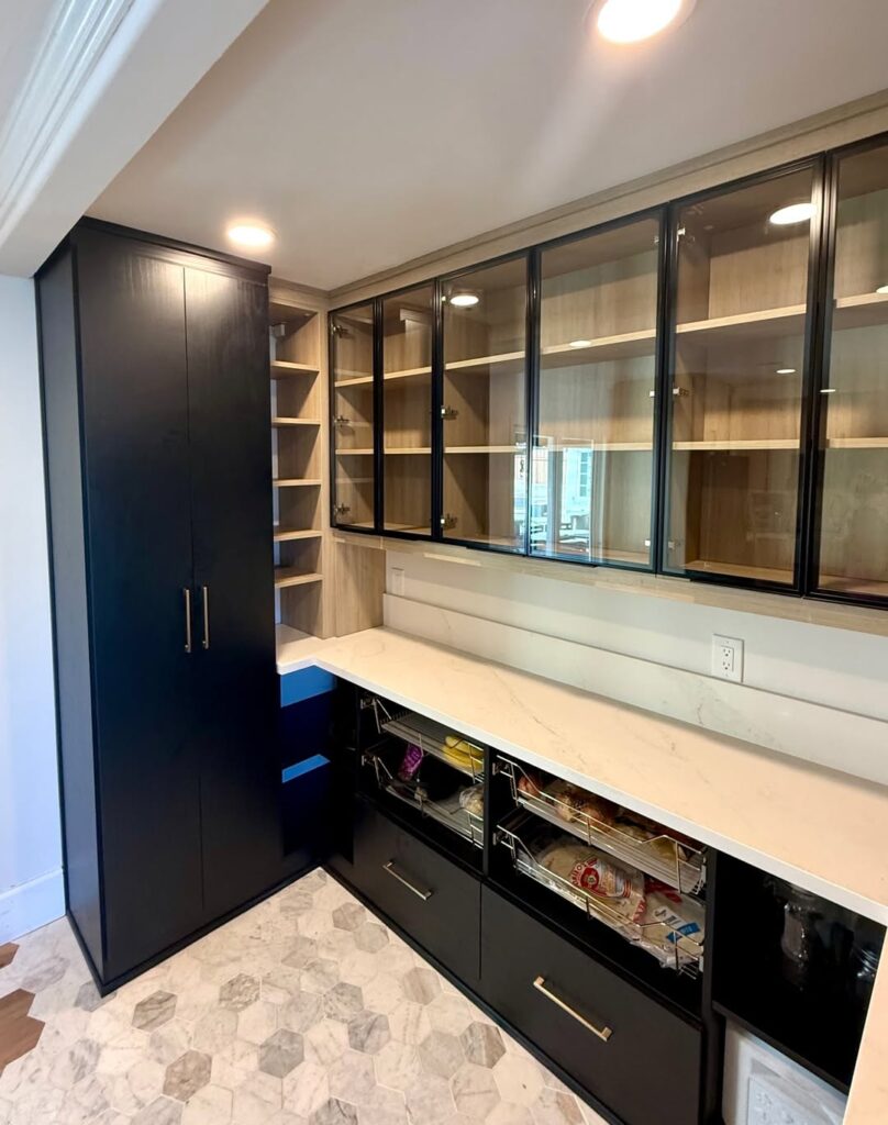 Pull-out shelves transform deep pantry cabinets into accessible storage spaces. Instead of reaching blindly into the back, you simply slide the shelf forward to see everything at once. This design reduces food waste because items don’t get forgotten. They are especially helpful for canned goods, jars, and packaged foods. Soft-close rails add a premium touch and prevent slamming. Pull-out shelves are excellent for small kitchens where every inch matters. They create a clean, modern feel and make organizing groceries faster and more enjoyable for daily use.