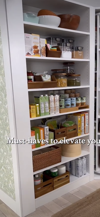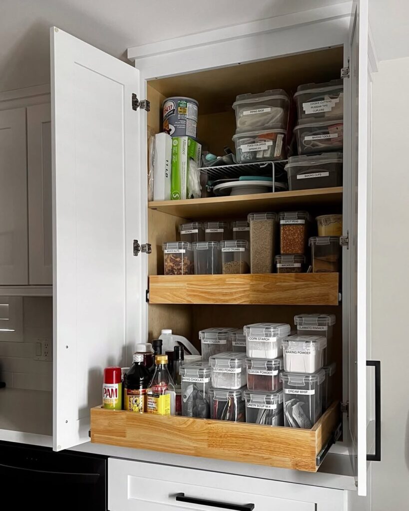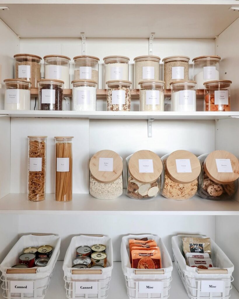 This idea focuses on uniform containers and clear labels placed on clean, minimalist shelves. Using matching jars for grains, pasta, and snacks creates a visually calming pantry. Labels make identification quick and easy. This system reduces packaging clutter and improves freshness. Airtight containers preserve food longer. The aesthetic is modern and organized. It encourages maintaining order since everything has a place. Perfect for people who love clean design and efficiency.