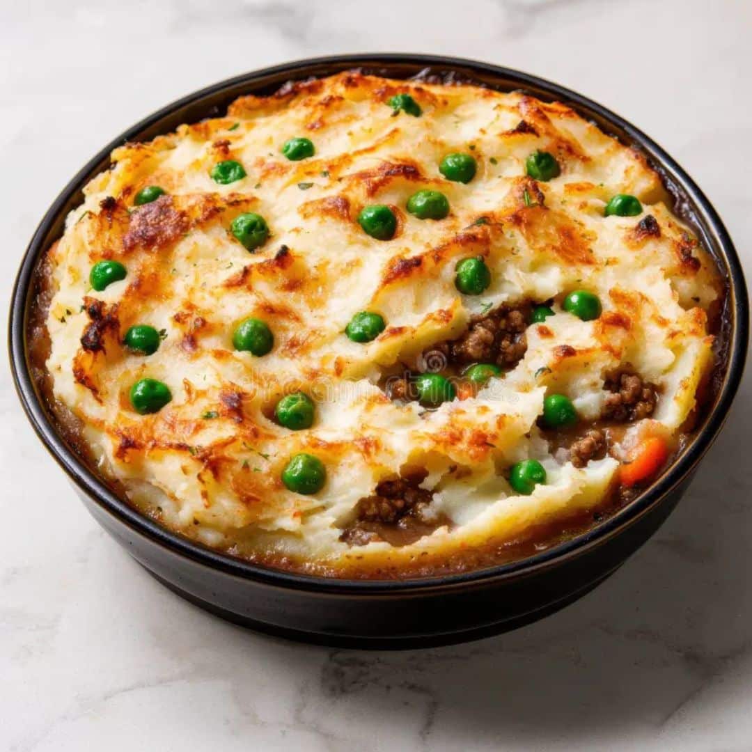 A comforting casserole layered with savory ground beef, peas, and creamy mashed potatoes.
