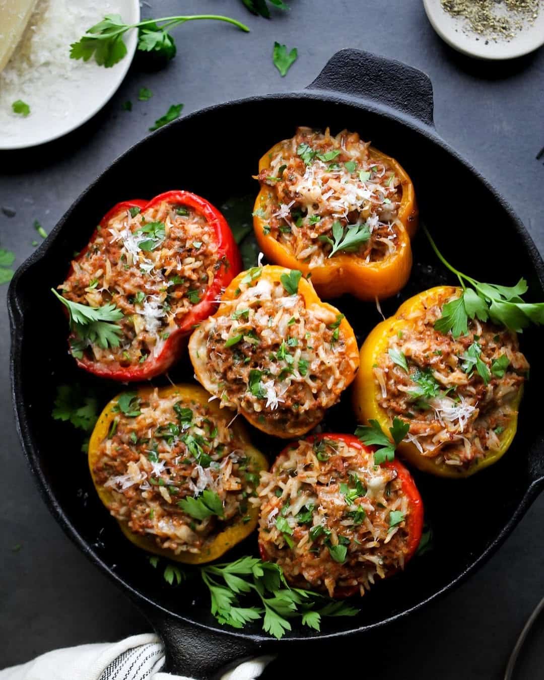• Description: Bell peppers filled with quinoa, beans, and veggies, then baked.