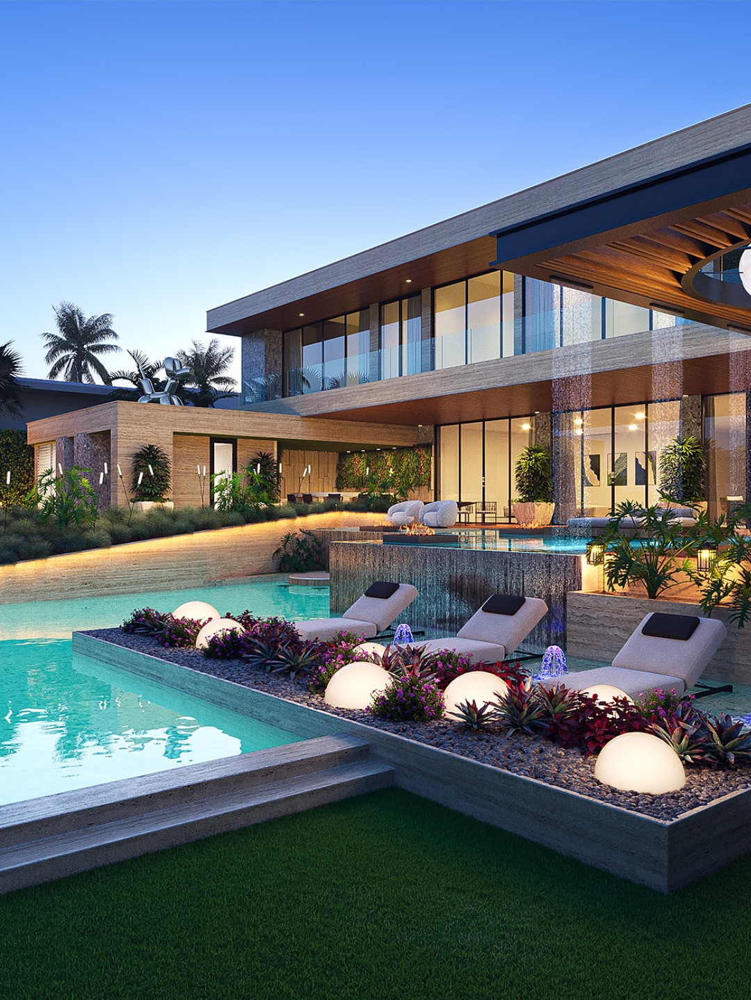 Place large ceramic planters with tall grasses or palms for a polished appearance.