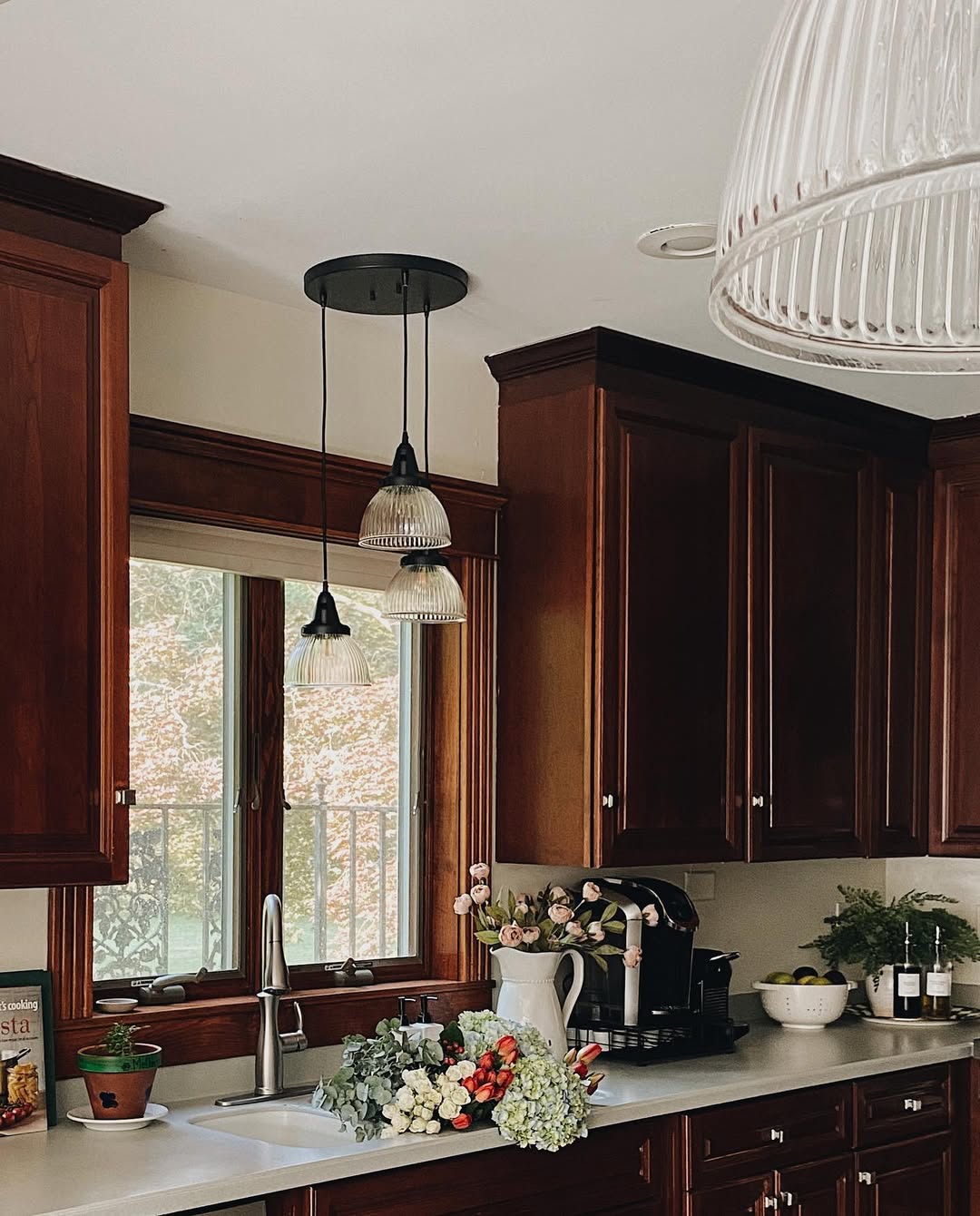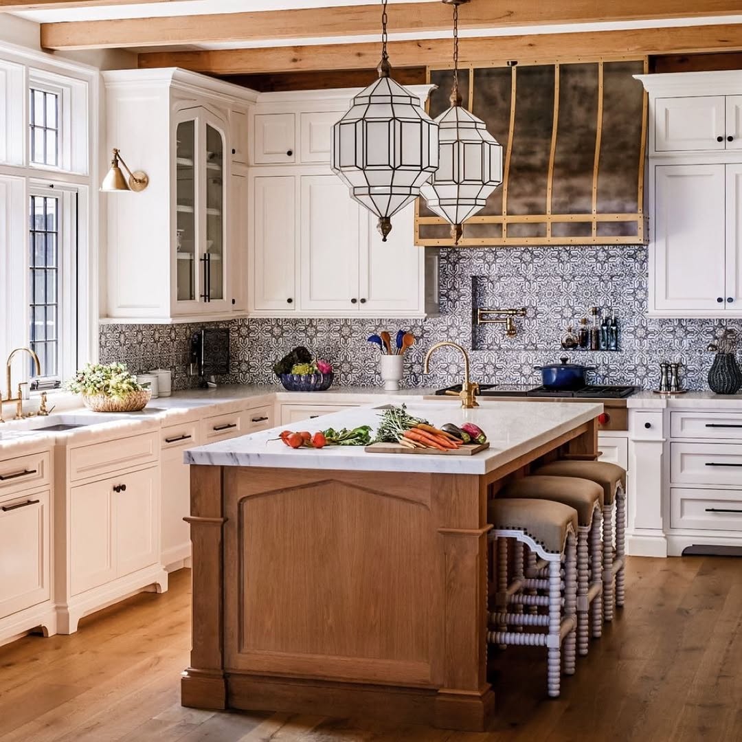 Copper accents bring a warm glow to rustic kitchens. Whether displayed on a hanging pot rack or open shelves, copper cookware adds both function and vintage charm. Over time, the patina develops naturally, contributing to the farmhouse aesthetic. Pair copper with marble or wood surfaces for a balanced contrast. Even small touches—like copper handles, mixers, kettles, or trays—enhance the rustic appeal. When mixed with darker metals like wrought iron, the result is a layered, artisanal look. Copper is timeless, making the kitchen feel lively, warm, and full of character.