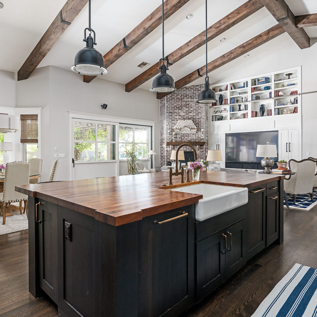 Butcher block countertops offer warmth and practicality, making them a staple in rustic kitchen design. Their natural wood pattern brings softness to spaces dominated by stone or metal. With proper care, these countertops age gracefully, gaining character over time. They pair well with cream cabinets, deep green tones, or raw wood finishes. Whether used throughout the kitchen or only on an island, butcher block creates a welcoming, artisanal vibe. It’s ideal for home cooks who enjoy baking or preparing ingredients by hand, as the surface is forgiving and tactile. The result is a cozy, handcrafted kitchen ambiance.