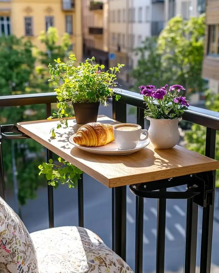 Turn your balcony railing into a stylish mini bar or breakfast counter with a foldable railing-mounted tabletop. Pair it with two slim bar stools that can tuck underneath when not in use. Add a few small succulents or a tiny herb planter for charm. This setup maximizes vertical space and frees the floor, making the balcony feel larger. Perfect for enjoying sunset drinks, working on your laptop, or having quick meals outdoors. The railing bar design is functional, trendy, and ideal for balconies with beautiful views or limited floor area.