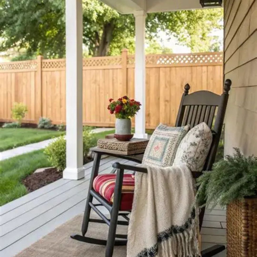 A single rocking chair can instantly add charm and character to a small front porch. Choose a classic wooden or modern metal design depending on your home’s style. Pair it with a soft cushion and a small accent table for practicality. This setup evokes a nostalgic, welcoming feeling and encourages moments of rest. Even one rocking chair can make the porch feel intentional and inviting. It’s a timeless idea that works especially well for traditional or farmhouse-style homes.