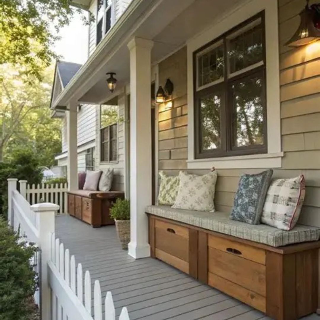Incorporating storage into a small front porch improves both style and functionality. Benches with hidden compartments, slim cabinets, or decorative baskets provide space for shoes, umbrellas, or outdoor accessories. Choose pieces that double as seating or decor to avoid overcrowding. Keeping items organized prevents the porch from feeling cluttered. Smart storage solutions make the area more practical while maintaining a clean, welcoming appearance. This idea is perfect for homeowners who want beauty and usefulness in a limited space.