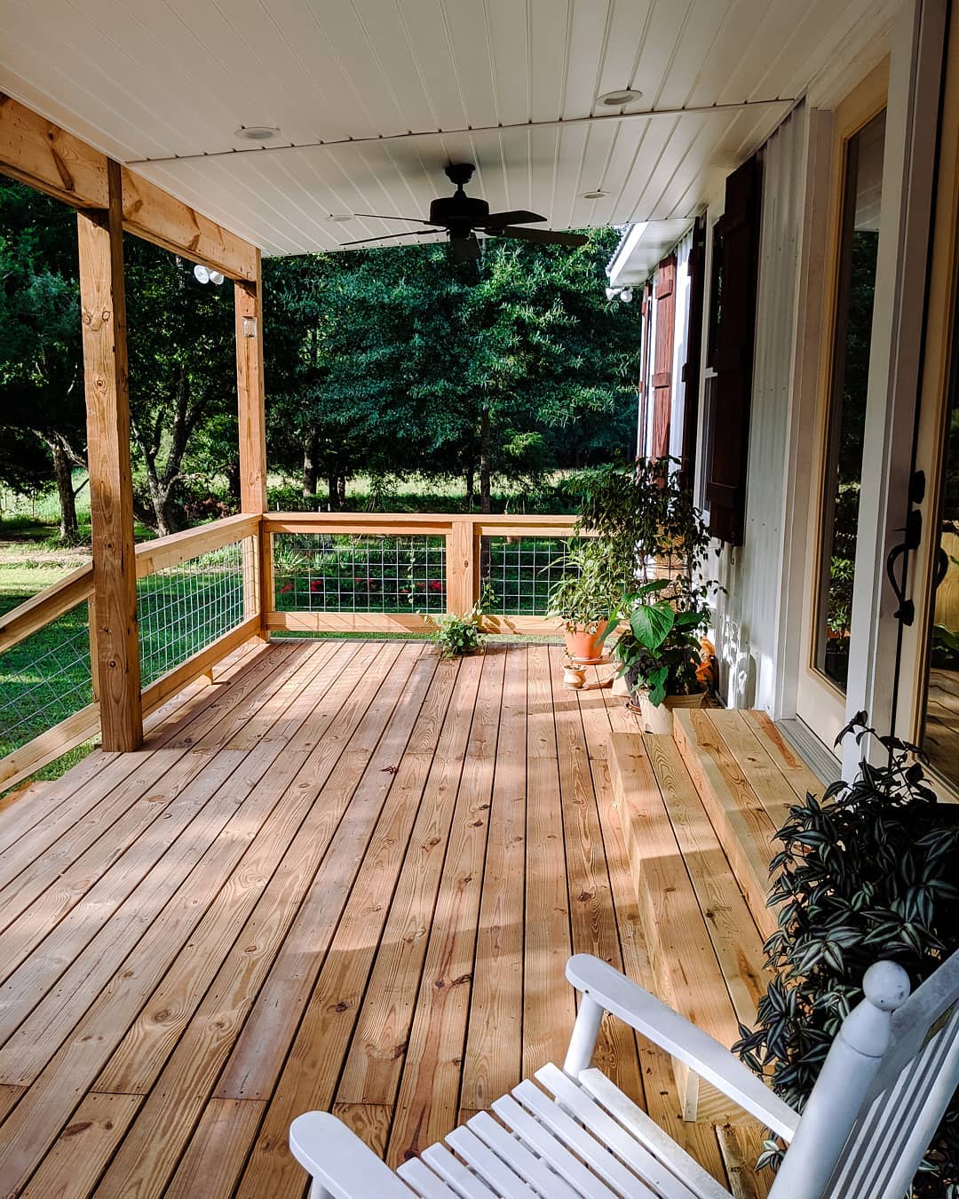 Natural wood elements bring warmth and texture to a small front porch. Wooden planters, benches, or ceiling details create a cozy, organic feel. Light or medium wood tones prevent the space from feeling heavy or crowded. Pair wood accents with greenery and neutral fabrics for balance. This idea works well with rustic, coastal, or modern farmhouse styles. Natural materials make the porch feel grounded and inviting, enhancing the overall charm of the home’s exterior.