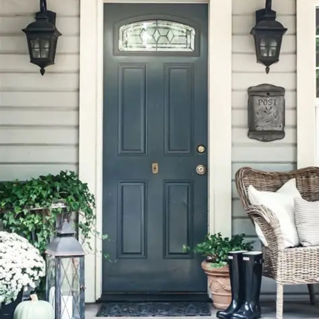 When space is tight, make the front door the star of the porch. Paint it a bold color such as navy, forest green, or deep red to draw attention. Complement it with coordinated hardware, a stylish doormat, and a simple wreath. This approach adds personality without using much space. A statement door creates strong curb appeal and gives the porch a polished look. It’s an easy, cost-effective way to refresh a small porch and make a lasting impression.
