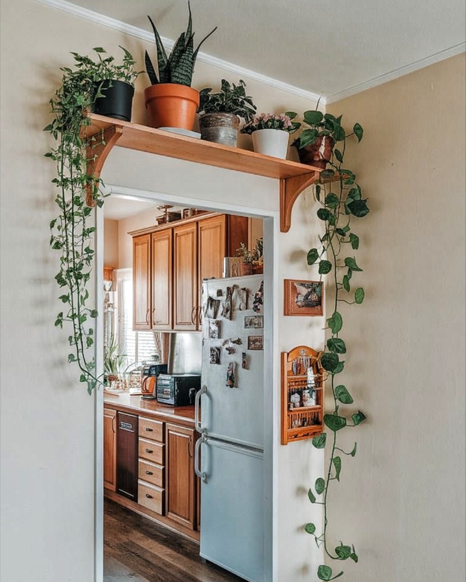 Plants breathe life into small kitchens, softening hard lines and adding natural beauty. Choose compact, low-maintenance plants like herbs, succulents, or pothos, which thrive in bright indoor spaces. Hanging planters, magnetic fridge planters, or slim windowsill pots save counter space. Herbs like basil or rosemary add fragrance and function, making them both decorative and useful for cooking. Greenery enhances air quality and helps break up the monotony of cabinets and appliances. Whether you prefer a single statement plant or a cluster of mini pots, greenery adds vibrancy, warmth, and a refreshing touch to tight spaces.