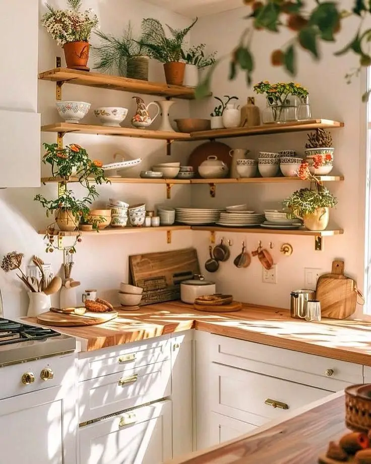 Instead of hiding everything behind cabinets, turn your prettiest kitchen tools into decorative elements. Display wooden cutting boards, copper pans, ceramic bowls, glass jars, or herbs in small pots to add personality. Open shelves or wall hooks make everyday items accessible while creating a warm, lived-in atmosphere. This works especially well when sticking to a cohesive color palette or material theme. The key is intentional styling—avoid overcrowding and choose items that look neat and purposeful. This approach blends function with style, transforming storage into décor while giving your small kitchen an inviting, curated look.