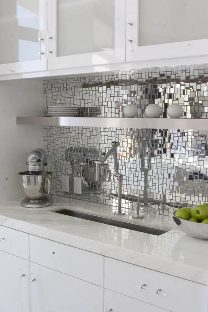 Mirrors reflect light and create the illusion of depth, making them perfect for compact kitchens. Install a mirrored backsplash behind the stove or sink to open up the room instantly. If mirrors aren’t your style, glossy ceramic or glass tiles offer a similar reflective effect with more color options. These surfaces bounce light around the kitchen, making it look brighter and less enclosed. They’re also easy to clean and add a polished, modern touch. Pair with simple cabinetry and minimal décor for maximum impact. This technique is especially effective in windowless or narrow galley kitchens.