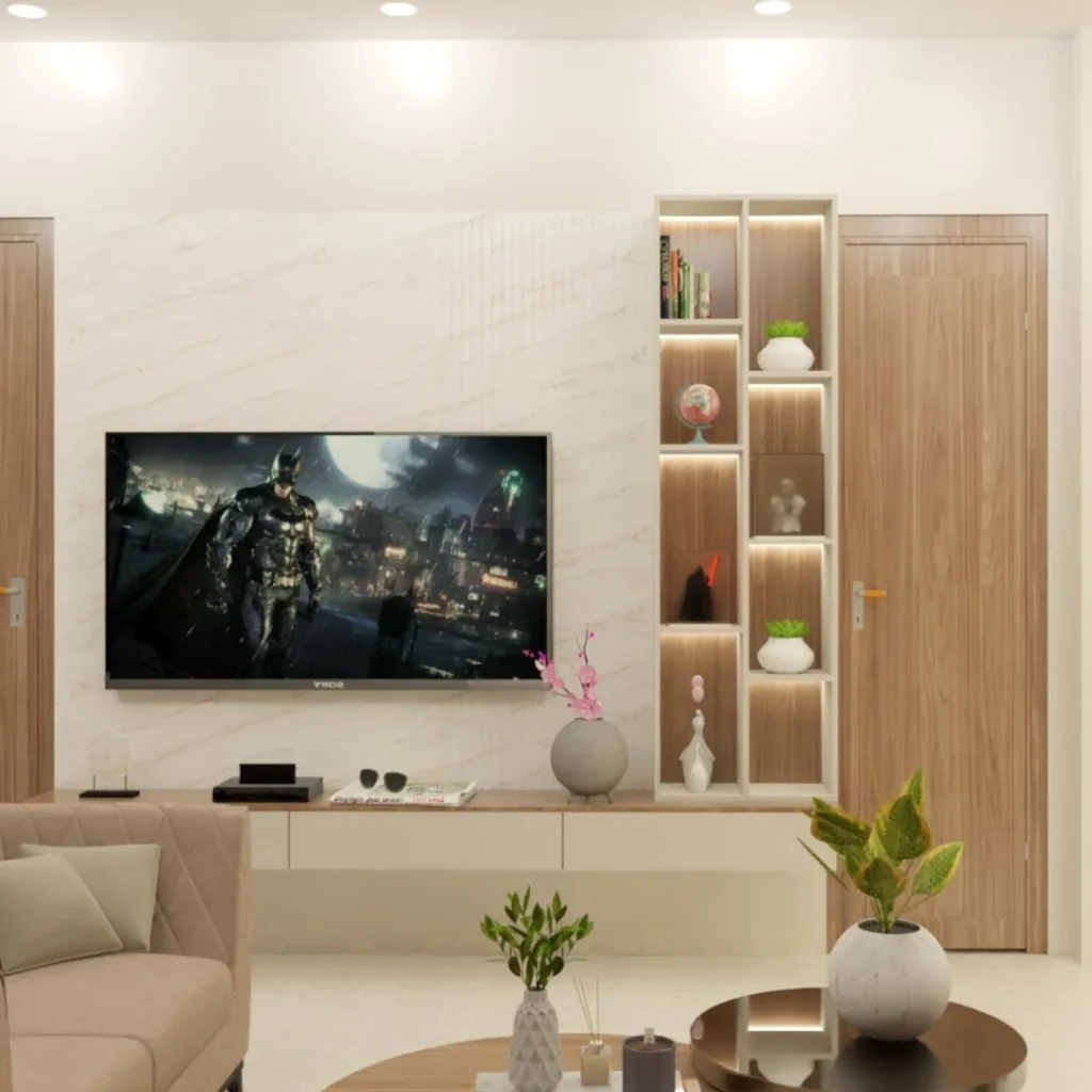When floor space is limited, vertical storage becomes essential in a small living room. Tall shelves, wall-mounted cabinets, and floating units help utilize wall height without crowding the room. Vertical storage keeps items organized while drawing the eye upward, making the room appear taller. Display shelves can hold books, decorative pieces, or indoor plants, adding personality without clutter. Wall-mounted TV units free up floor space and create a clean, modern look. By thinking vertically, you maintain functionality while preserving valuable floor area for movement and comfort.