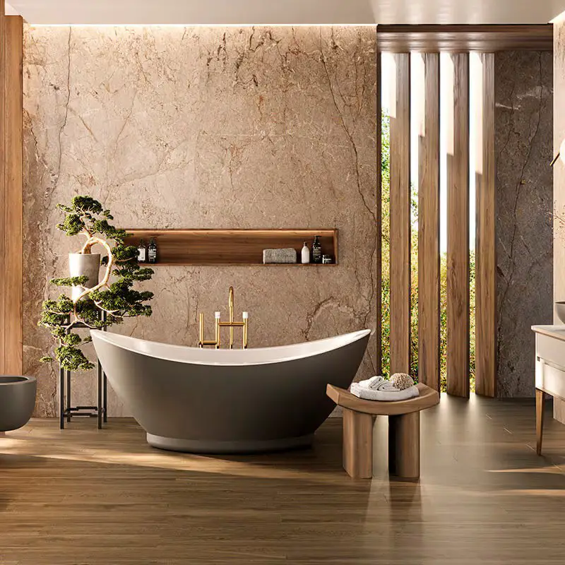 A deep, freestanding soaking tub serves as the centerpiece of any spa bathroom. Opt for materials like stone resin or acrylic and consider placing the tub near a large window or under a skylight. Add bath trays for candles, books, or a glass of wine. This setup invites deep relaxation and unwinding.