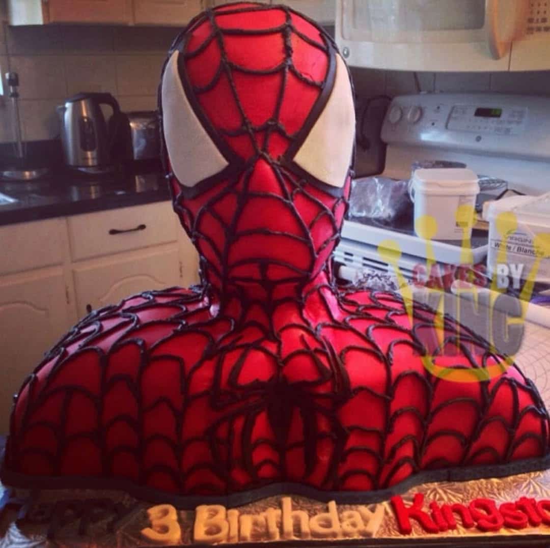 A cake shaped and decorated like Spider-Man’s mask, complete with bold webbing and striking white eyes. Ideal for themed parties wanting a recognizable superhero instantly.