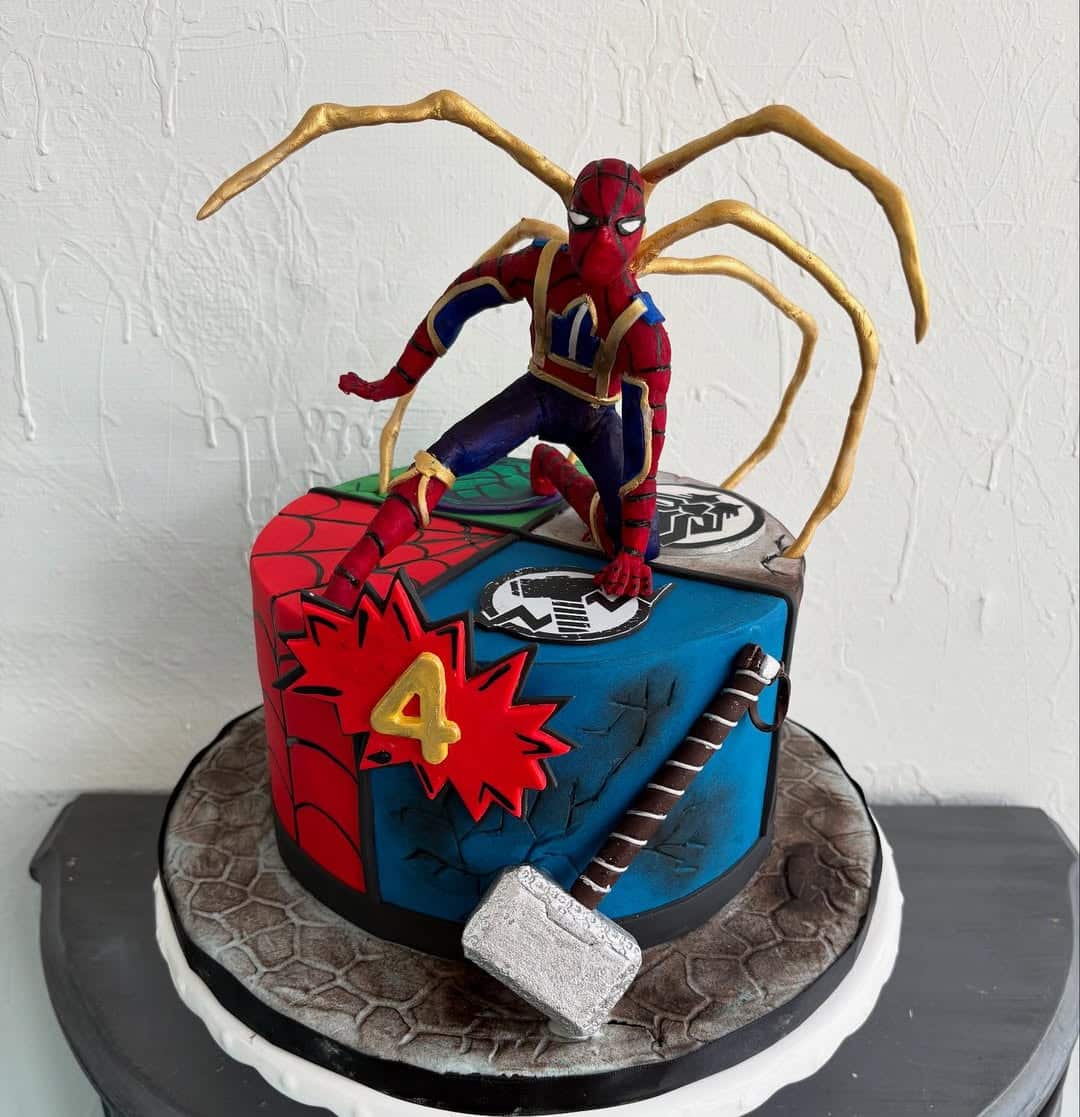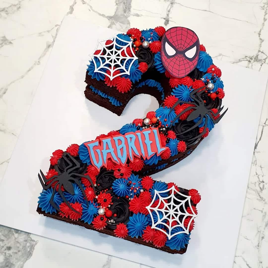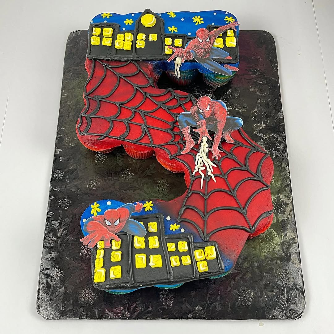 A cake shaped like the birthday child’s age, decorated with webs, mini Spider-Man emblems, and bold colors. Personalized and fun.