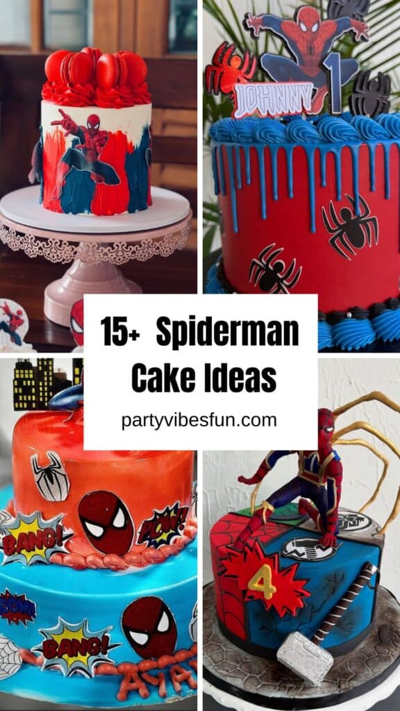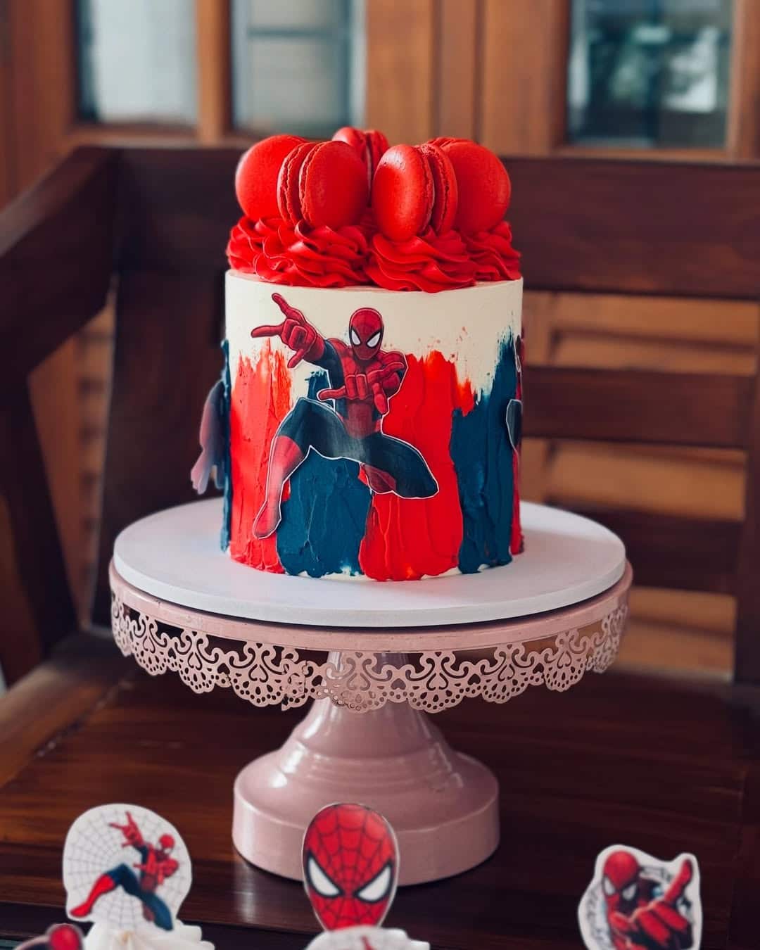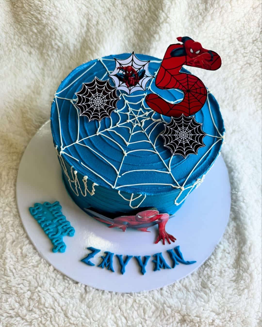 A cake shaped like the birthday child’s age, decorated with webs, mini Spider-Man emblems, and bold colors. Personalized and fun.