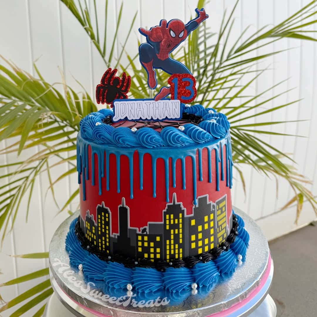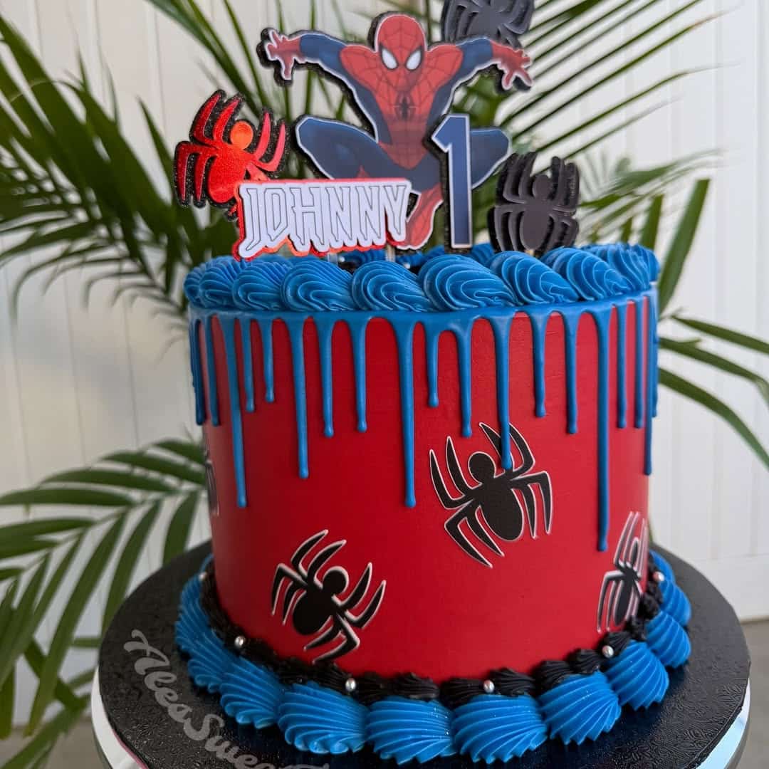 A tall layered cake with dramatic black or red drip glaze and a large Spider-Man topper. Stylish, modern, and eye-catching.