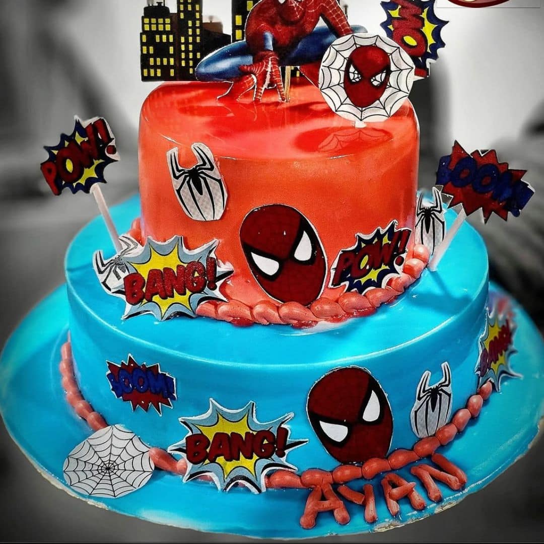 Kids especially enjoy cakes with 3D elements—such as Spiderman’s hand shooting webs made from sugar threads or fondant webs draped around the cake. Simpler buttercream versions can still look striking when decorated with edible prints, comic-style speech bubbles, or piped web patterns. Whether elegant or playful, Spiderman cakes bring a sense of adventure and heroism to any celebration, instantly transforming a birthday table into a mini Marvel universe.