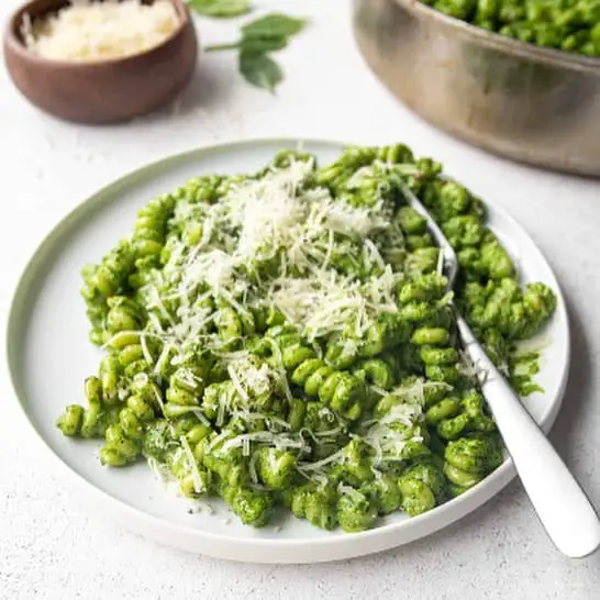 Blend spinach, garlic, nuts, parmesan, and olive oil into pesto.